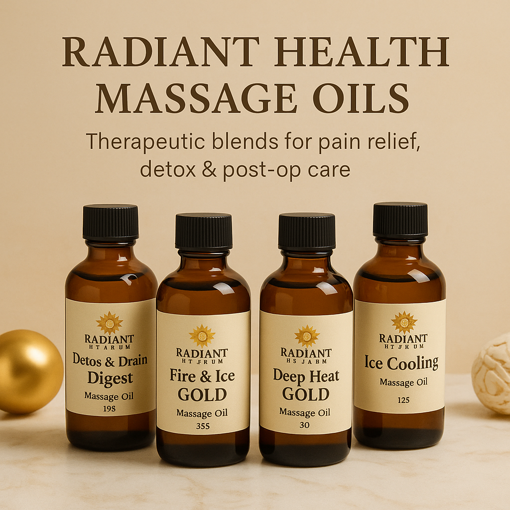 Handcrafted by Muriel Leenders, CLT, MLD-C – Radiant Health Massage LLC, these therapeutic oils are created to support pain relief, detox, circulation, lymphatic health, and post-operative recovery. Each blend is made in small batches with high-quality carrier oils and targeted essential oils to support specific needs.